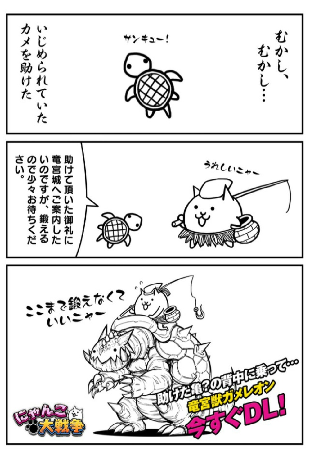 LINEポコポコ攻略サイトまとめ > 【にゃんこ大戦争】乗ってるネコが催促してるだと?→あらすじの書いたガメレオンのマンガが可愛すぎるww